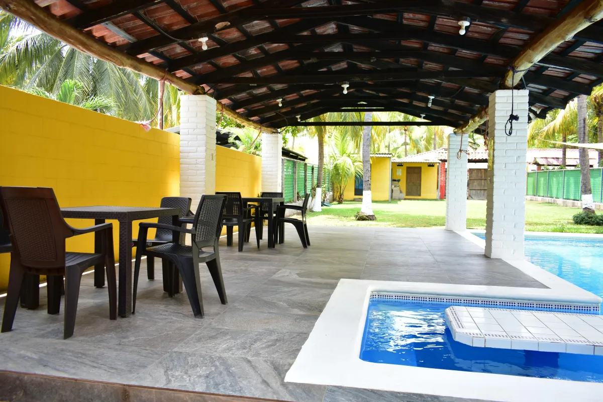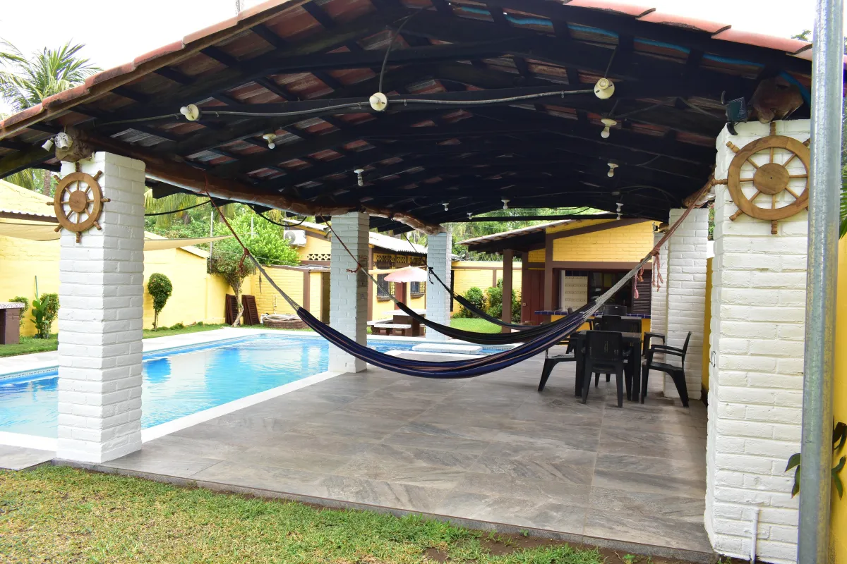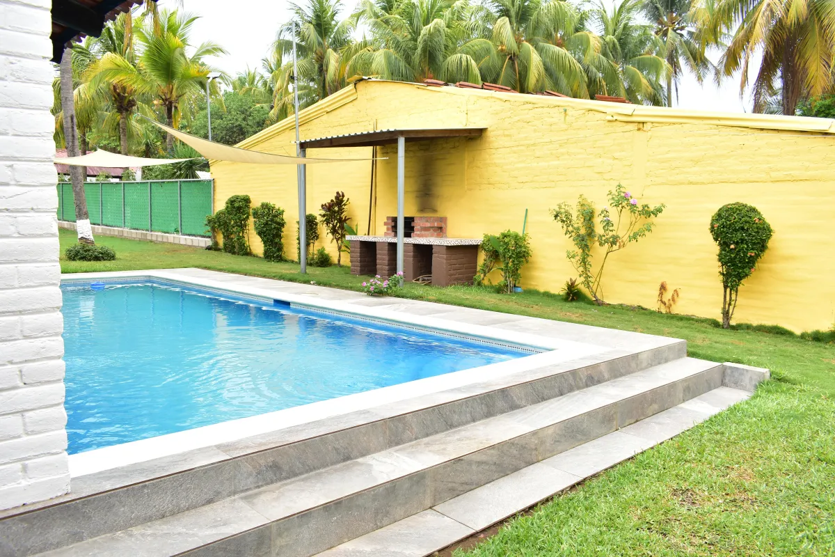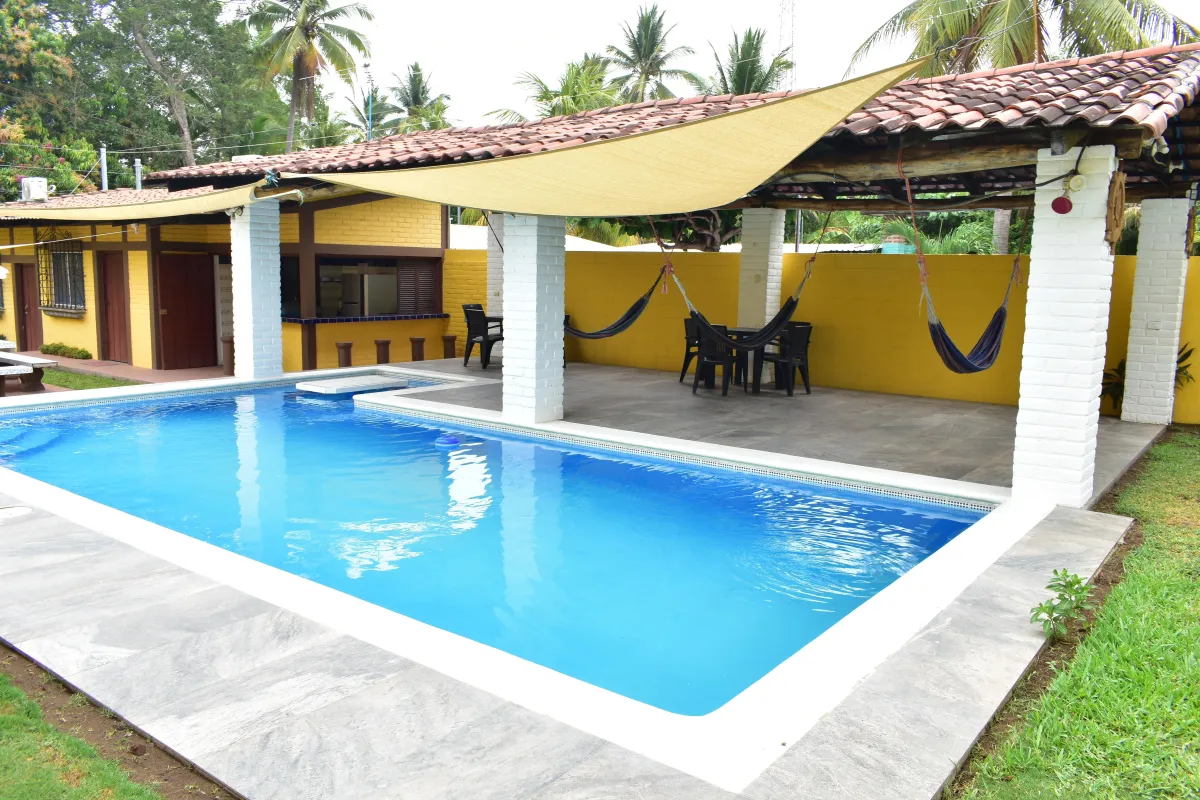 Rancho Privado en Costa Azul, con capacidad para 12 a 15 personas, piscina amplia y privada, 3 cuartos con aire acondicionado, 2 baños completos, WiFi, cocina equipada, area de BBQ, glorieta con hamacas, parqueo para 6 vehiculos.